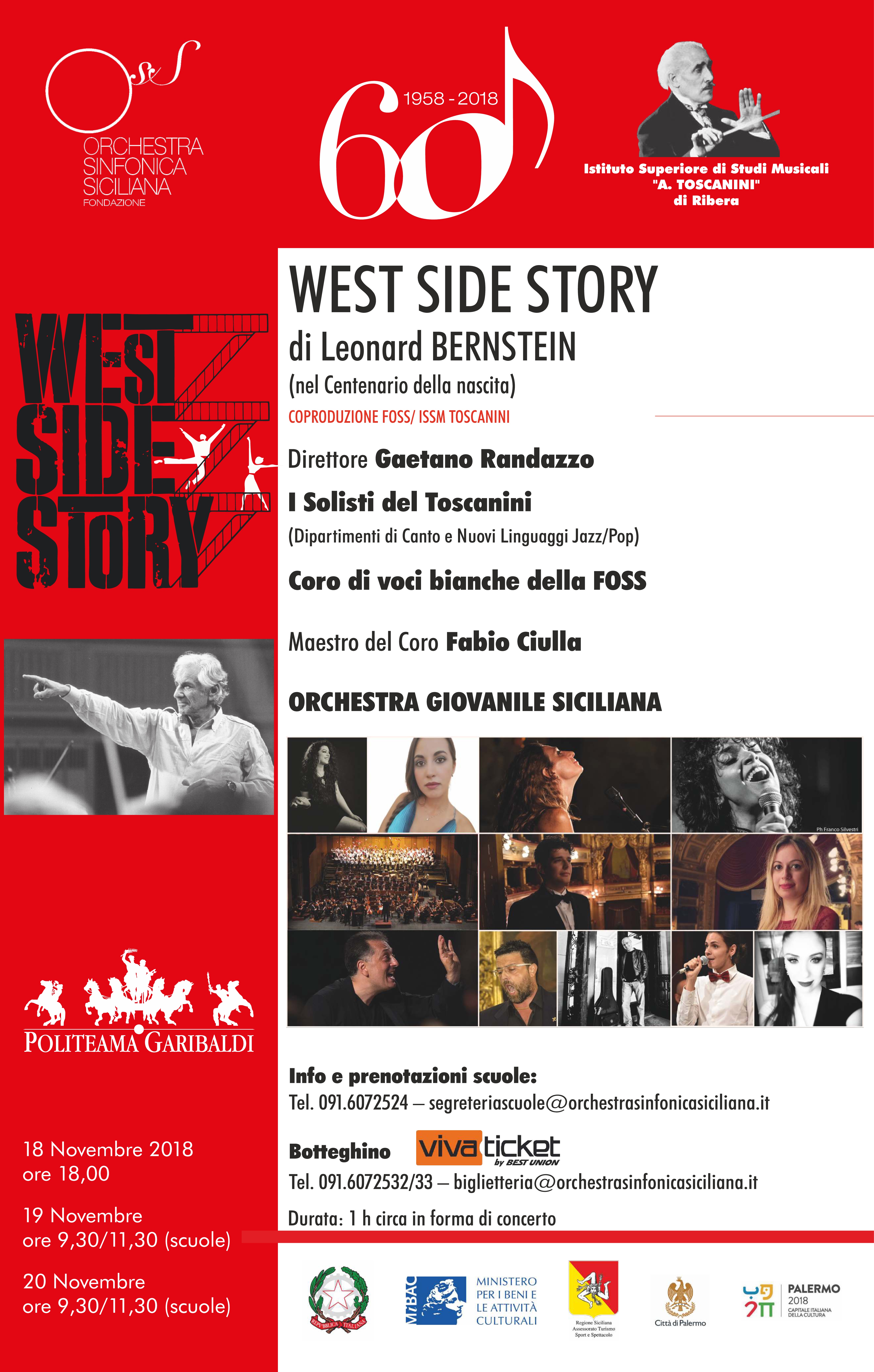 Nel centenario della nascita di Leonard Bernstein, la Fondazione orchestra Sinfonica Siciliana, in collaborazione con l’istituto Superiore di Studi Musicali “Arturo Toscanini” di Ribera (agrigento), gli rende omaggio con “West Side Story”, il più popolare dei lavori del grande compositore statunitense, che vedrà protagonisti tanti giovanissimi interpreti.