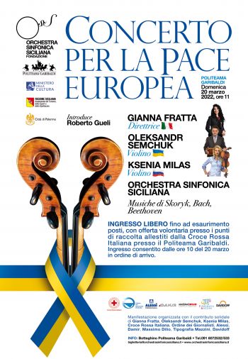 Domenica 20 marzo alle 11.00 al Politeama Garibaldi Concerto per la Pace Europea. In scena il violinista ucraino Semchuk e la violinista russa Milas. Orchestra Sinfonica Siciliana diretta da Gianna Fratta