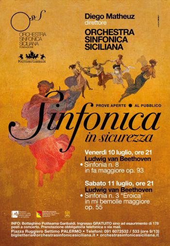 L’OSS dunque si prepara per Taormina e le prove saranno aperte al pubblico. Due appuntamenti serali (alle ore 21) al Politeama Garibaldi di Palermo con la musica di Beethoven: venerdì 10 luglio con la Sinfonia n. 8 in fa maggiore op. 93 e sabato 11 luglio con la Sinfonia n. 3 “Eroica” in mi bemolle maggiore op. 55.