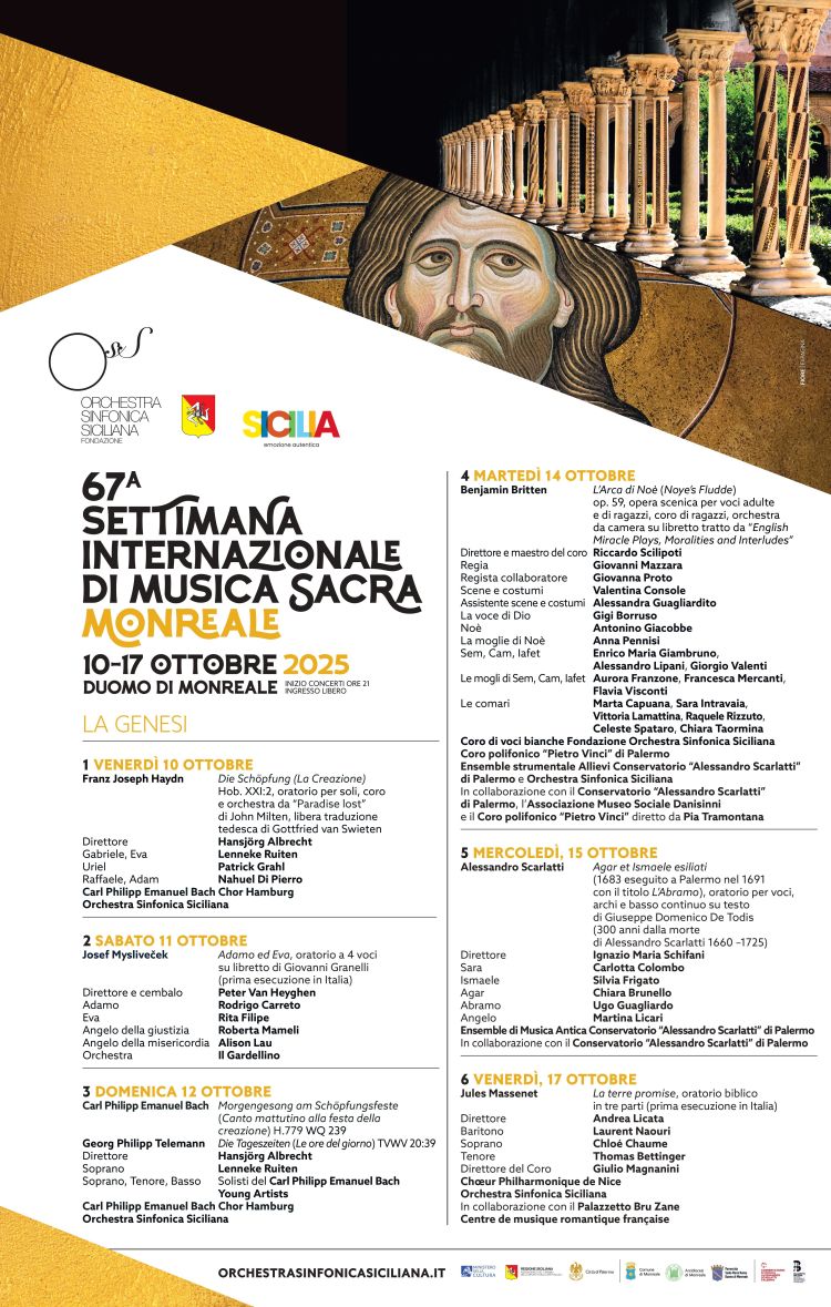 Inaugurata il 10 ottobre con Die Schöpfung (La Creazione) di Franz Joseph Haydn, diretta da Hansjörg Albrecht, la Settimana ha proposto un percorso musicale originale, interamente ispirato al tema della Creazione. Nella seconda serata è stato eseguito Adamo ed Eva di Josef Mysliveček con la direzione di Peter Van Heyghen e l’ensemble fiammingo Il Gardellino che ha offerto al pubblico la riscoperta di un oratorio settecentesco presentato in prima italiana, accolto da lunghi applausi. Successo analogo per il concerto del 12 ottobre, in cui l’Orchestra Sinfonica Siciliana e il Carl Philipp Emanuel Bach Chor Hamburg ancora una volta diretti da Albrecht hanno presentato pagine di C.P.E. Bach e Telemann. Momento di particolare emozione è stato quello del 14 ottobre con L’Arca di Noè di Benjamin Britten, che ha visto sul palcoscenico bambini e ragazzi del Coro di voci bianche FOSS, l’ensemble del Conservatorio “Alessandro Scarlatti” con quello della FOSS e il Coro Pietro Vinci, in un progetto di forte valore educativo e sociale. La Fondazione ha voluto dedicare quella serata alla memoria dei giovani uccisi a Monreale e a Palermo, con un messaggio di condanna della violenza e di speranza affidato alle voci dei più piccoli, accolto dal pubblico con grande commozione. Il 15 ottobre l’Ensemble di Musica Antica del Conservatorio “Scarlatti”, diretto da Ignazio Maria Schifani, ha celebrato il tricentenario di Alessandro Scarlatti con Agar et Ismaele esiliati, raro capolavoro del barocco italiano. Infine, il 17 ottobre, La Terre Promise di Jules Massenet ha concluso la rassegna: una pagina di grande respiro sinfonico-corale interpretata da Laurent Naouri, Chloé Chaume e Thomas Bettinger, che ha riscosso un successo unanime.
