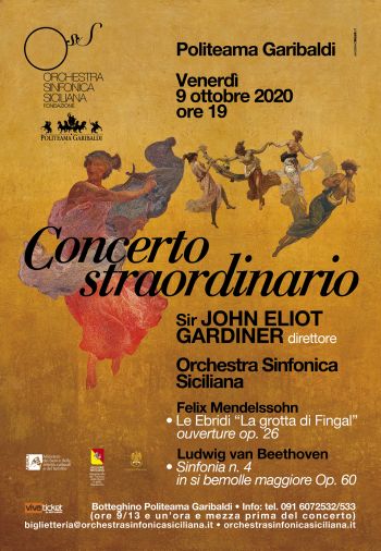 Sir John Eliot Gardiner dirigerà l’Orchestra Sinfonica Siciliana. Un omaggio del grande maestro inglese alla Sicilia, a Palermo. L’appuntamento è venerdì 9 ottobre alle ore 19 al Teatro Politeama Garibaldi: Le Ebridi "La grotta di Fingal", ouverture op. 26 di Felix Mendelssohn e la Sinfonia n. 4 in si bemolle maggiore op. 60 di Ludwig van Beethoven sarà il programma di questo concerto straordinario.