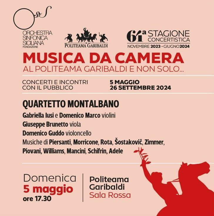 Inizia la stagione dei concerti di Musica da Camera al Politeama Garibaldi. Otto appuntamenti da domenica 5 maggio, poi a giugno e si riprende a settembre con concerti fino al 26 settembre. Si parte nella Sala rossa domenica (5 maggio alle 17,30) con il concerto del Quartetto Montalbano (il cui nome nasconde forse un omaggio al Camilleri giallista): un ensemble di costituzione assolutamente classica (due violini, viola e violoncello) che ha scelto di articolare i suoi concerti come un viaggio attraverso la grande musica da film del XX secolo, con particolare riferimento agli autori italiani e americani, E dunque, innanzi tutto, i Premi oscar Ennio Morricone e Nicola Piovani, sia pure alternando pagine assai note come C’era una volta in America, Nuovo Cinema Paradiso, Gabriel’s oboe da Mission, Baaria, Playing love da La leggenda del pianista sull’Oceano e La vita è bella ad altre come Il Padrino di Nino Rota. Sul fronte del cinema americano svettano invece Moon River di Henry Mancini e molte fra le soundtrack più importanti di John Williams, Hans Zimmer, Adele, Lalo Schrifin e Dmitrij Šostakovič.