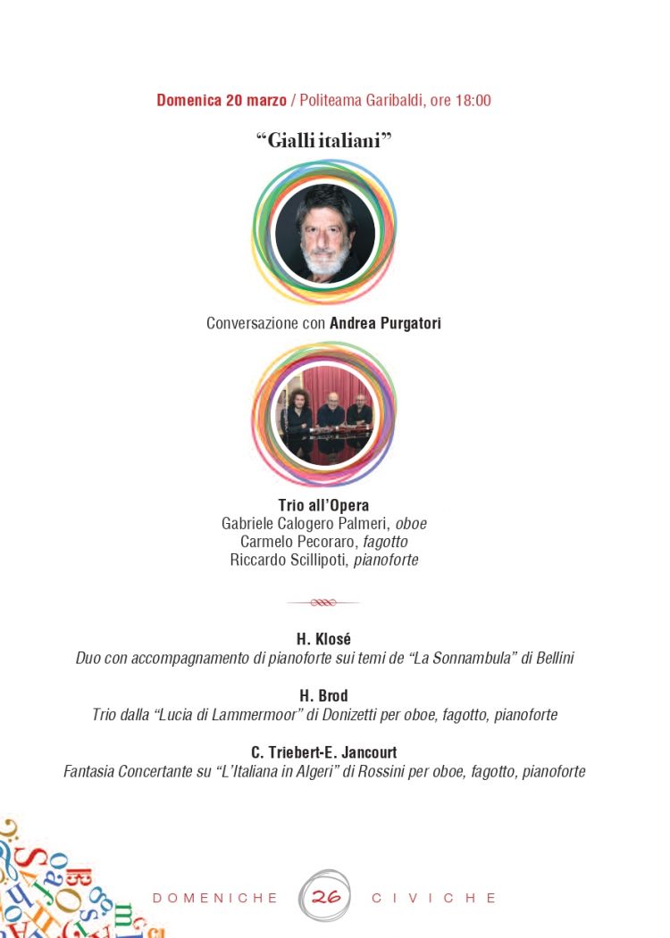 Dopo la conversazione “Gialli italiani”, in linea con il format della rassegna, il concerto del Trio all'Opera, formato da tre prime parti dell'Orchestra Sinfonica Siciliana: Gabriele Palmeri (oboe), Carmelo Pecoraro (fagotto), Riccardo Scilipoti (pianoforte). Il trio nasce dalla comune passione per l’opera italiana e per la valorizzazione del repertorio ad essa dedicato. Il Trio propone lavori che mettono in risalto il lirismo e il virtuosismo dell’oboe e del fagotto, col supporto armonico del pianoforte, spaziando in un repertorio molto vasto, dal Settecento alla musica contemporanea. Composto da tre musicisti dalle carriere personali di grande rilievo nel settore sia solistico che cameristico, il Trio si è già esibito in vari teatri e sale della Sicilia per varie associazioni musicali. In programma il Duo con accompagnamento di pianoforte sui temi de La Sonnambula di Bellini di Hyacinthe Klosé, il Duo dalla Lucia di Lammermoor di Donizetti per oboe, fagotto, pianoforte di Henri Brod, la Fantasia Concertante su L’Italiana in Algeri di Gioachino Rossini per oboe, fagotto, pianoforte di Charles Louis Triébert e Eugène Louis-Marie Jancourt.