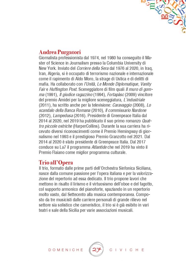“Gialli italiani” con Andrea Purgatori per “Domeniche Civiche” e il Trio all'Opera