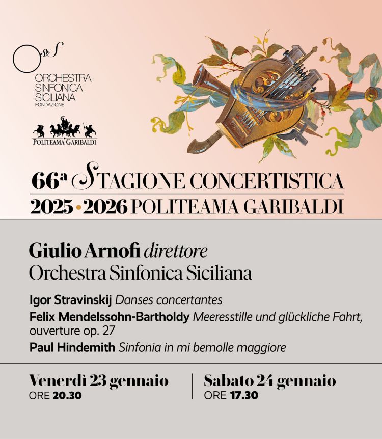 Prosegue al Politeama Garibaldi la 66ª Stagione concertistica dell’Orchestra Sinfonica Siciliana prosegue con i consueti due concerti settimanali venerdì 23 (ore 20.30) e sabato 24 gennaio (ore 17.30) con un programma di grande densità musicale, affidato alla bacchetta di Giulio Arnofi, al suo debutto sul podio della compagine palermitana. In programma tre pagine tra Ottocento e Novecento firmate da Igor Stravinskij, Felix Mendelssohn-Bartholdy e Paul Hindemith, che rivelano poetiche e contesti storici profondamente diversi, ma accomunati da una forte tensione formale e da un’intensa riflessione sul ruolo della musica nella società.