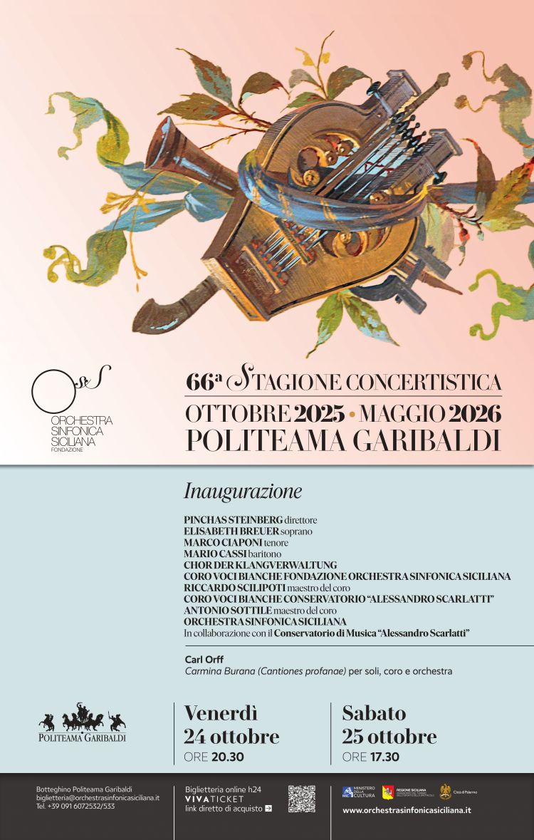 Si apre con uno dei capolavori più noti del Novecento musicale, i Carmina Burana di Carl Orff, la 66ª Stagione concertistica della Fondazione Orchestra Sinfonica Siciliana, una stagione costruita tra repertorio e scoperta, grandi ospiti e valorizzazione dei talenti. L’appuntamento inaugurale è in programma venerdì 24 ottobre alle ore 20.30 (nuovo orario di inizio dei concerti serali del venerdì) e sabato 25 ottobre alle ore 17.30 al Politeama Garibaldi di Palermo.