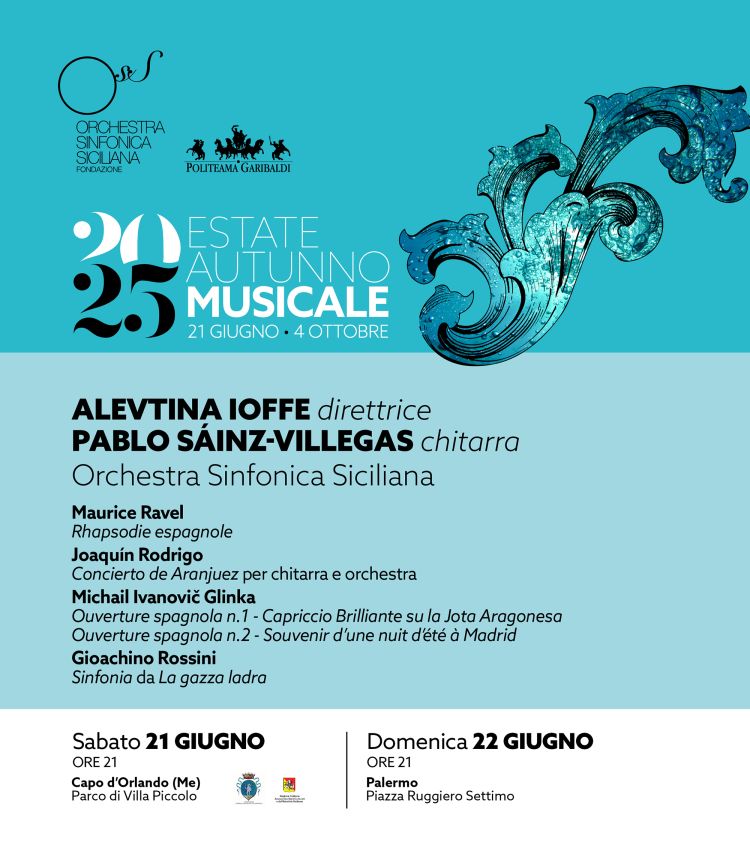 Inaugurazione sabato 21 giugno (ore 21) in uno degli scenari più ricorrenti dell’estate musicale dell’Orchestra Sinfonica Siciliana: Villa Piccolo a Capo d’Orlando, replica domenica 22 giugno (ore 21) in piazza Ruggiero Settimo (davanti al Politeama Garibaldi) a Palermo, con una serata all’insegna del virtuosismo, interamente dedicata a pagine ispirate alla Spagna. Sul podio Alevtina Ioffe, tra le interpreti più interessanti della sua generazione, recentemente nominata direttrice principale dell’Opera di Berna e già ospite delle maggiori istituzioni internazionali. Accanto a lei, il chitarrista Pablo Sainz-Villegas, definito «l’erede di Andrés Segovia» e noto in tutto il mondo per la sua straordinaria eleganza interpretativa e le capacità da grande virtuoso, che eseguirà il celebre quanto difficile Concierto de Aranjuez di Joaquín Rodrigo.