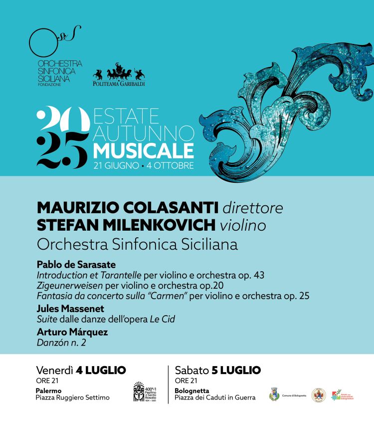 La stagione estiva dell’Orchestra Sinfonica Siciliana torna per una tappa all’aperto a Palermo, in piazza Ruggiero Settimo, venerdì 4 luglio alle ore 21 (biglietti euro 5 ed euro 10) e poi continua il suo viaggio attraverso alcune località dell’Isola sabato 5 luglio a Bolognetta, in piazza Caduti in guerra, sempre alle ore 21 (ingresso gratuito).