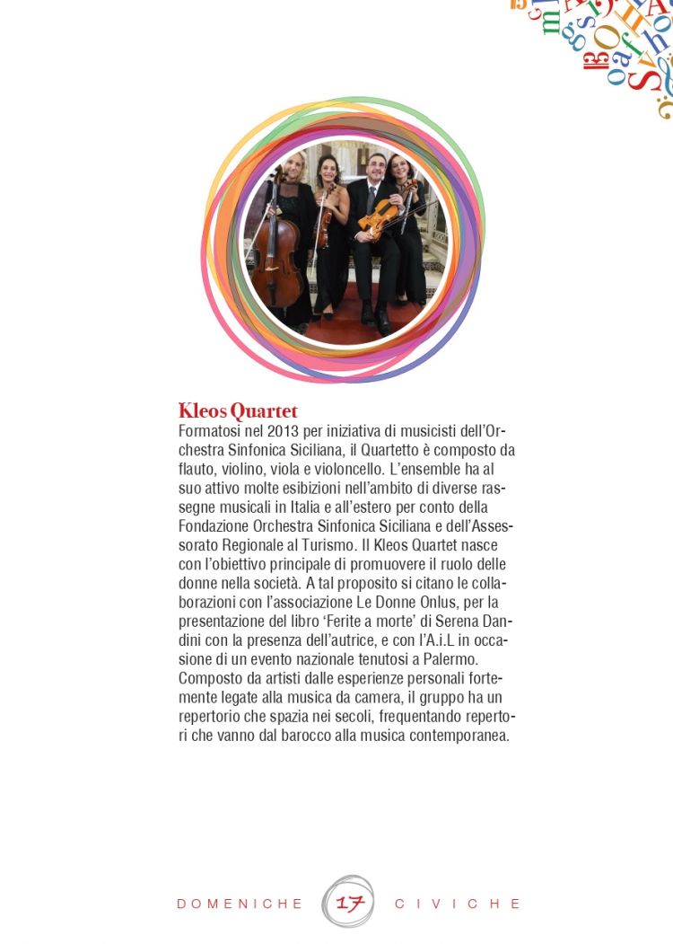 Per “Domeniche Civiche”, il Kleos ha concepito un percorso che parte da Mozart, di cui verranno eseguiti i primi due dei quattro Quartetti che il Salisburghese scrisse per l'organico in questione. Entrambe le composizioni risalgono al periodo di Mannheim e sono frutto della commissione del flautista dilettante olandese Ferdinand Dejean.