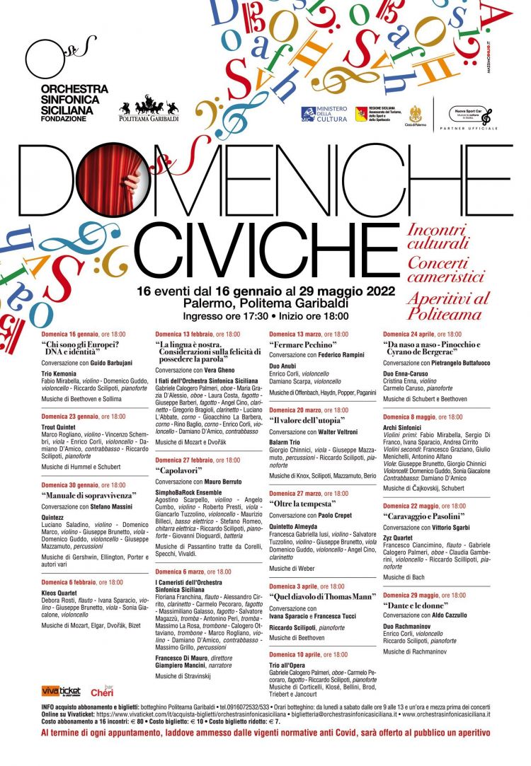 "Domeniche Civiche" ha così attirato l'attenzione di un'utenza trasversale, interessato alla riflessione sui temi di maggiore attualità come all'ascolto dal vivo della musica camera. L'iniziativa, concepita dalla direttrice artistica Gianna Fratta come un secondo cartellone da affiancare alla stagione concertistica in corso, intende proprio aggregare la cittadinanza su tematiche di diffuso interesse e promuovere al contempo quel repertorio cameristico che esula in prima battuta dai programmi di un'istituzione sinfonica. Via libera allora ad un'operazione che offre al pubblico i tesori di uno scrigno inesauribile di spartiti, sui quali gli stessi professori d'orchestra si sono formati o continuano a scoprire nel loro work in progress. È il caso degli elementi dell'Orchestra Sinfonica Siciliana, che trovano in "Domeniche Civiche" un'ulteriore e non meno esaltante occasione per esprimere il proprio talento.