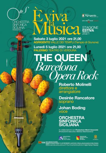 Un soprano, una voce rock, una band, un coro e un’orchestra insieme sul palco per riproporre, oltre alle grandi hit della band inglese, il capolavoro dei Queen, Barcelona, album nato dall’incontro tra due leggende della musica, il leader della band britannica Freddie Mercury e il soprano Montserrat Caballé. THE QUEEN - Barcelona Opera Rock è il titolo dei prossimi due concerti del cartellone estivo della FOSS “È viva la musica” che si terranno alle ore 21 in due luoghi suggestivi della Sicilia: sabato 3 luglio nella Valle dei Templi (Tempio di Giunone) ad Agrigento e lunedì 5 luglio a Palermo al Teatro di Verdura in prima assoluta.