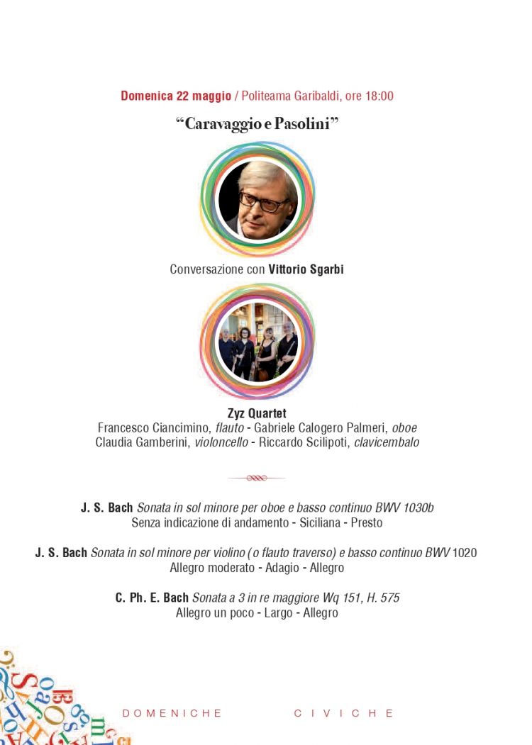 Caravaggio e Pasolini è il titolo della conversazione di Vittorio Sgarbi, ospite domenica 22 maggio delle Domeniche Civiche. Concerto dello Zyz Quartet