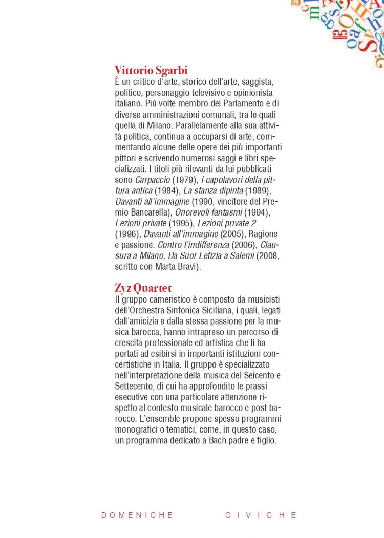Vittorio Sgarbi, ospite domenica 22 maggio delle Domeniche Civiche. Concerto dello Zyz Quartet