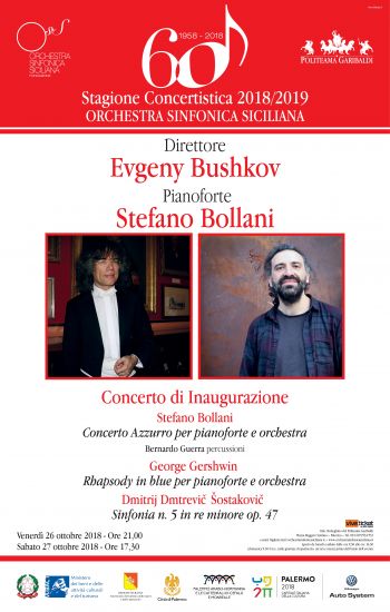 L'Orchestra Sinfonica Siciliana apre la sessantesima stagione concertistica al Politeama Garibaldi di Palermo venerdì 26 ottobre con "Concerto Azzurro" di Stefano Bollani e l'Orchestra diretta dal russo Evgeny Bushkov. "Il titolo - secondo il compositore - evoca l'azzurro del cielo, il quinto chakra, quello dell'udito che invita l'uomo ad ascoltare se stesso e gli altri, e il colore azzurro capace di stimolare l'energia creativa". Nella seconda parte del concerto, musiche di George Gershwin e Dmitrij Šostakovič.