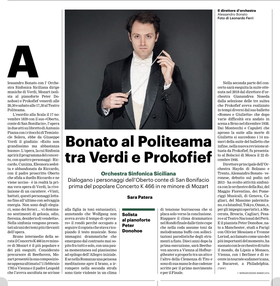 Alessandro Bonato sul podio e Peter Donohoe al pianoforte per Verdi, Mozart e Prokof’ev