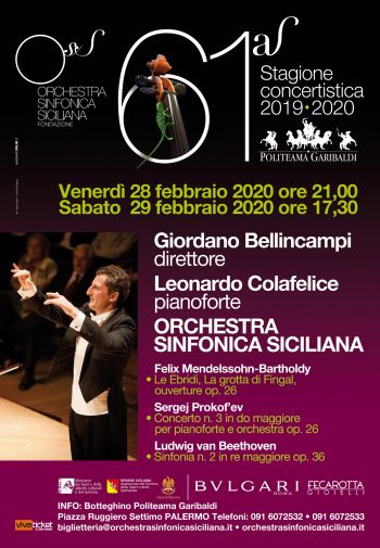 L’Orchestra Sinfonica Siciliana, diretta da Giordano Bellincampi, presenta venerdì 28 febbraio alle ore 21 e sabato 29 febbraio alle ore 17,30 al Politeama Garibaldi l’Ouverture op.26 ”La grotta di Fingal” di Mendelssohn, il Concerto n.3 in do maggiore op.26 per pianoforte e orchestra di Prokof’ev con solista il pianista Leonardo Colafelice e la Sinfonia n.2 in re maggiore op.36 di Beethoven.