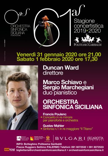 L’Orchestra Sinfonica Siciliana, diretta da Duncan Ward, presenta venerdì 31 gennaio alle ore 21 e sabato 1 febbraio alle ore 17,30 al Politeama Garibaldi, un interessante programma: il Concerto in re minore per due pianoforti e orchestra di Francis Poulenc eseguito dal Duo pianistico Marco Schiavo-Sergio Marghegiani e la sublime Sinfonia n.1 in re maggiore “Il Titano” di Gustav Mahler.