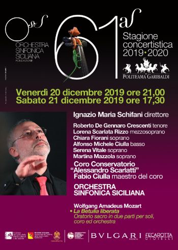 Venerdì 20 dicembre alle 21 e sabato 21 dicembre alle 17,30 al Politeama Garibaldi, l’Orchestra Sinfonica Siciliana, diretta da Ignazio Maria Schifani, esegue l’oratorio sacro in due parti per soli, coro e orchestra di Mozart La Betulia liberata con i Solisti e il Coro Conservatorio di Musica A. Scarlatti (Fabio Ciulla maestro del Coro).