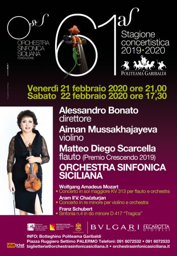 L’Orchestra Sinfonica Siciliana, diretta da Alessandro Bonato, presenta venerdì 21 febbraio alle ore 21 e sabato 22 febbraio alle ore 17,30 al Politeama Garibaldi, il Concerto in sol maggiore KV 313 per flauto e orchestra di Mozart (solista il flautista vincitore del Premio Crescendo 2019 Matteo Diego Scarcella), il Concerto in re minore per violino e orchestra di Chačhaturjan con solista la violinista Aiman Mussakhajayeva e la Sinfonia n.4 in do minore D 417 “Tragica” di Schubert.