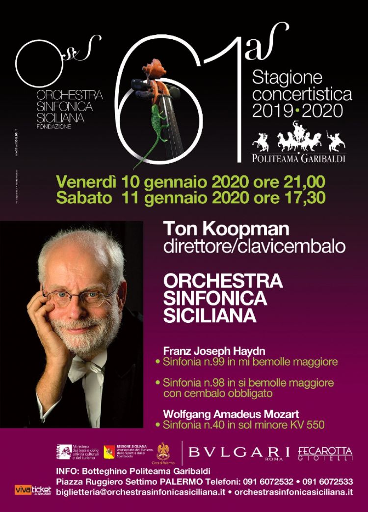 L’acclamato direttore olandese Ton Koopman dirige l’Orchestra Sinfonica Siciliana al Politeama Garibaldi Venerdì 10 Gennaio 2020 alle ore 21 e Sabato 11 Gennaio alle ore 17,30. In programma: Franz Joseph Haydn Sinfonia n. 99 in mi bemolle maggiore e Sinfonia n.98 in si bemolle maggiore con cembalo obbligato (con solista al cembalo lo stesso Ton Koopman). Chiude il concerto la Sinfonia n.40 in sol minore KV 550 di Wolfgang Amadeus Mozart.